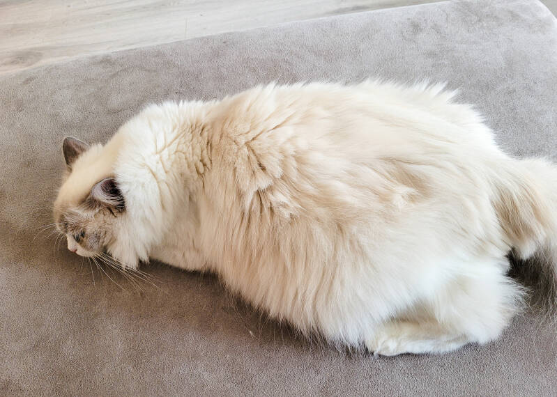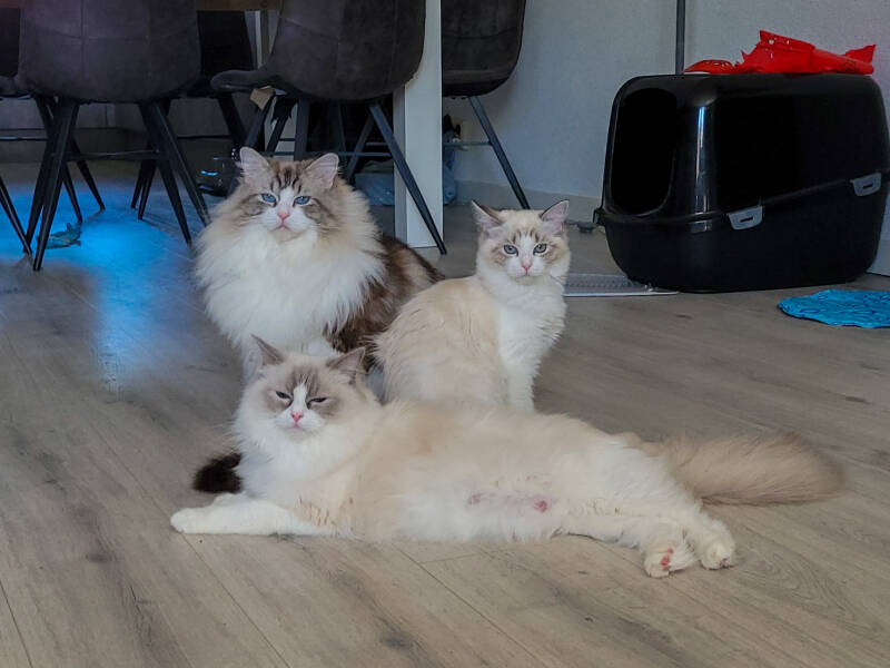 Fay is nog heel relaxt, ze eet veel kleine beetjes want meer kan er niet in. Ze scharrelt door het hele huis. De bevallingskist zie ik haar nog niet veel in. Komt wel. Ze moet nog een week. Daar waar ze de afgelopen week onze kitten van 20 weken verzorgde en knuffelde, is ze nu weer te druk en zet ze haar op haar plaats. Ook de bak wordt veelvuldig gebruikt en slaapt ze veel.